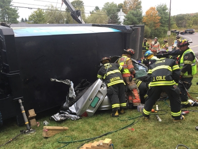 ~~ On 9/28/2015 at approximately 14:51 hours, the Essex Fire Department responded to Vermont Route 128 near the intersection of Weed Road for a motor vehicle crash with entrapment. The Essex Junction Fire Department, and Essex Rescue were simultaneously dispatched as well. Upon the arrival of the Fire Chief approximately 2 minutes later, Clarks Truck Center was summoned with heavy wreckers to assist with this difficult extrication. Heavy wreckers from Tail Hook Towing were also summoned by the owners of the trucking company and working as a team, the patient was removed from the car approximately 45 minutes into the call. The driver of the car suffered severe life threatening injuries and was transported to the UVM Medical Center by Essex Rescue. Essex Police, Vermont Department of Motor Vehicle Inspectors, and the Vermont State Police Traffic Safety Team all responded to investigate this crash.