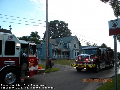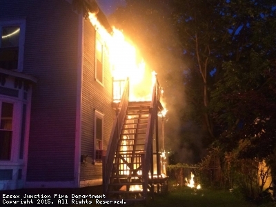 At 05:07 hrs, the Essex and Essex Junction Fire Departments along with Essex Rescue and Police were dispatched to a reported structure fire at 22 Central Street in the Village of Essex Junction. First reports were that there were occupants trapped on the second floor. Two police officers arrived on scene to discover the fire consuming the delta (right) side of the residence, including a porch with fire progressing into the eves and second floor of the structure. They were able to confirm within a few minutes that everyone had in fact made it out of the residence on their own.