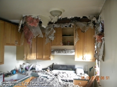 At this time, the crew from Engine 2 had extinguished the exterior of the building and advanced their line up the stairs to the kitchen area of the second floor, meeting up with the members from Engine 5. With smoke banked down and the great probability of fire extension into the attic, the firefighters went to work opening up the ceiling in the kitchen. After some time of pulling the ceiling (which had blown in and fiberglass insulation), firefighters were able to see that flames had spread only a minimal distance into the attic, and the area was thoroughly wet down.